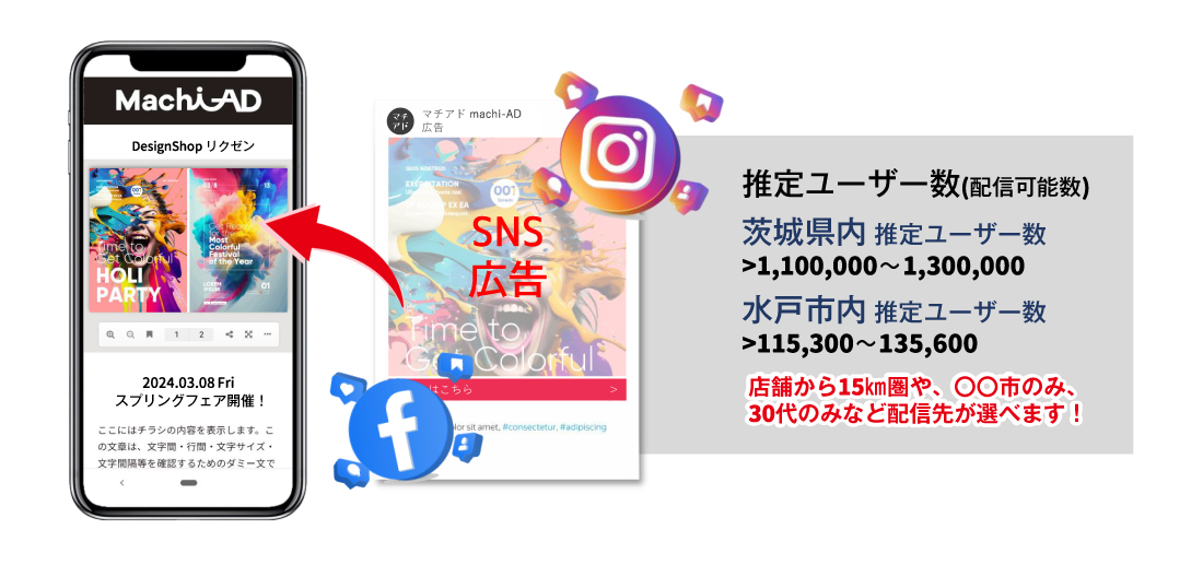 チラシやパンフレットのデータを、お客様専用ページに掲載し、ターゲットに向けたSNS広告(instagram・facebook) からダイレクトに誘導。いつもは見てもらえないターゲットへチラシの閲覧を促します!